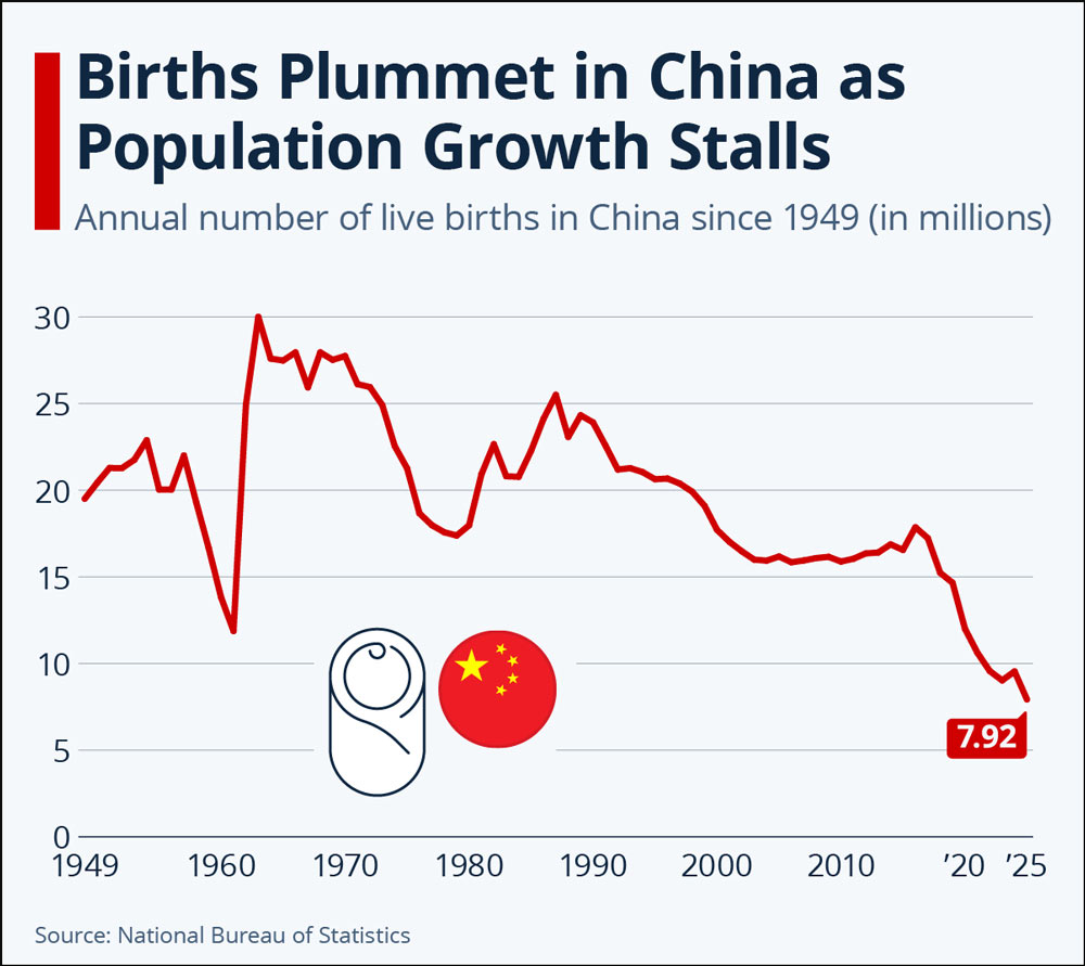Just 7.9 million babies were born in China in 2025, the lowest number recorded in more than 70 years.