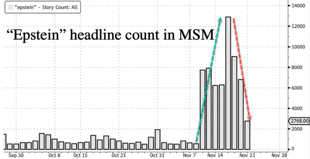 According to Bloomberg’s tracking data, after remaining steady for months, mainstream media mentions of “Epstein” surged on the day President Trump signed the spending bill to reopen the federal government, after spiking during the shutdown.