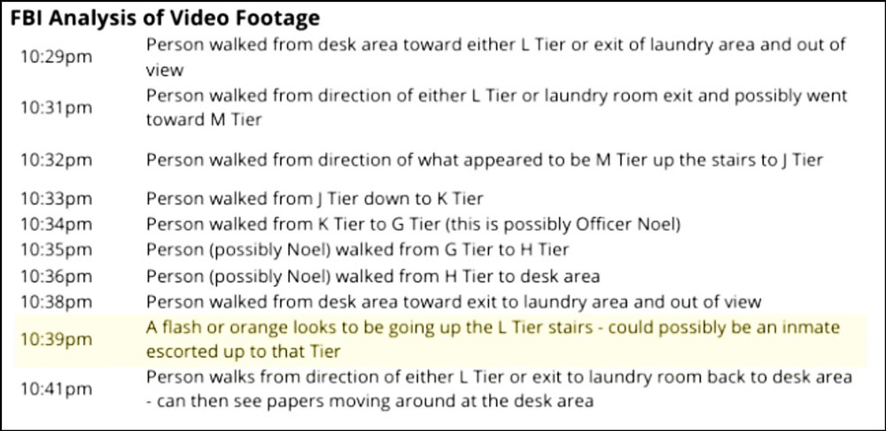 “A flash of orange looks to be going up the L Tier stairs — could possibly be an inmate escorted up to that Tier,” CBS News reported from an observation log tied to the footage.