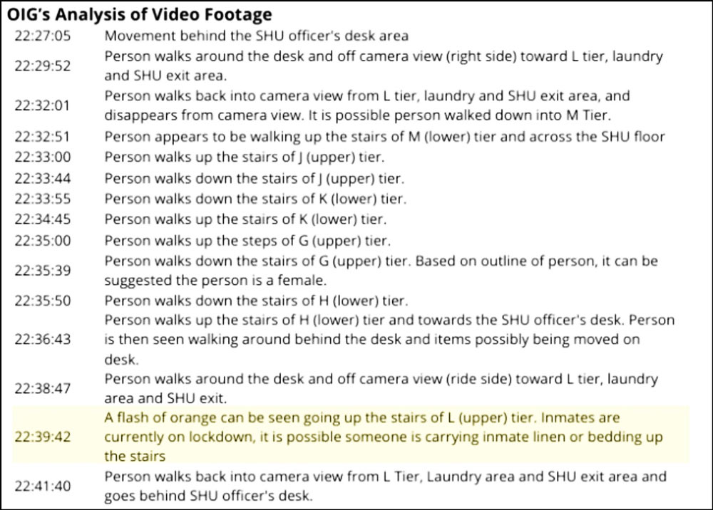 Yet the inspector general ultimately logged it as an unidentified corrections officer carrying orange linen or bedding, despite officers on duty reportedly stating no linens were replaced during that shift.