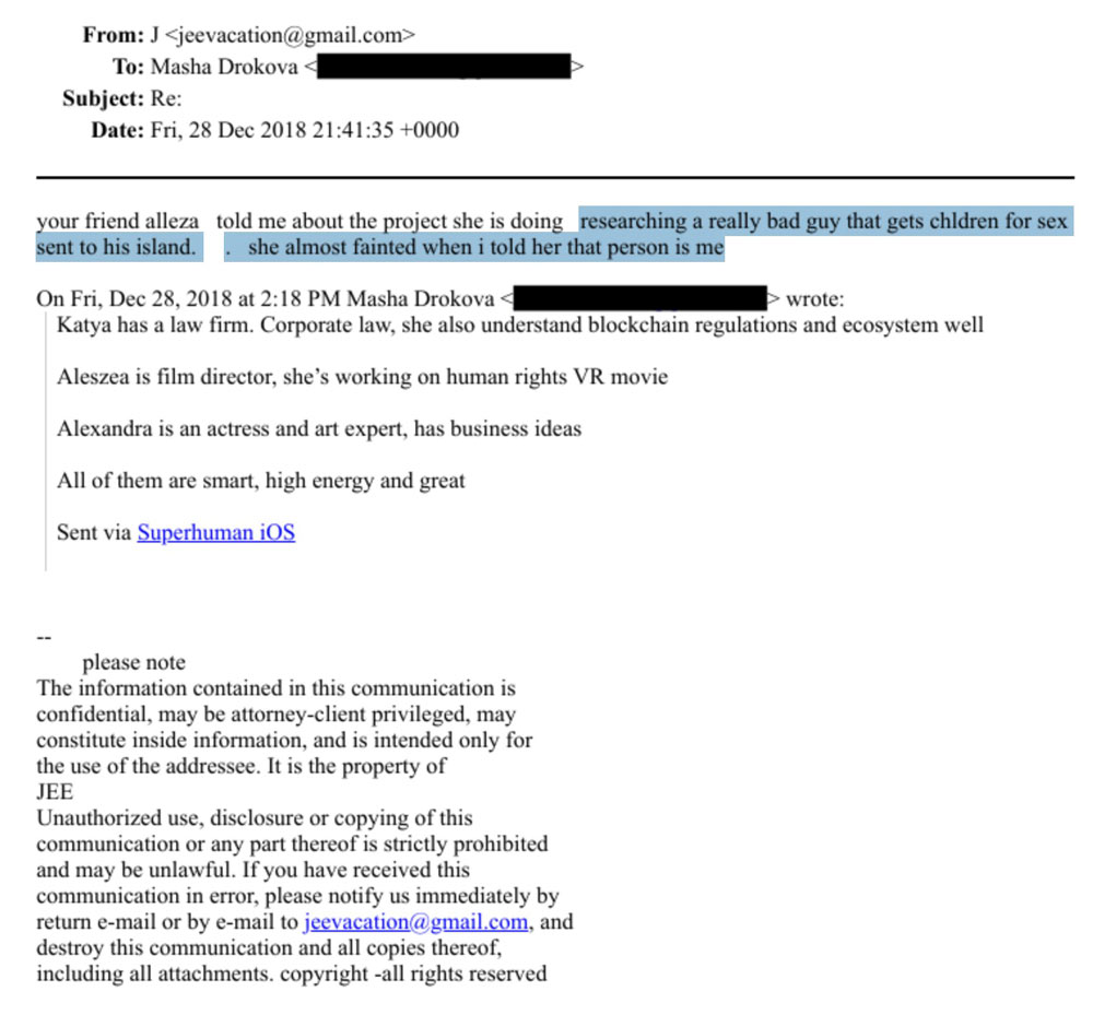 In an email to Russian venture capitalist Masha Drokova, Epstein described a conversation involving a film director researching “a really bad guy that gets children for sex sent to his island.”