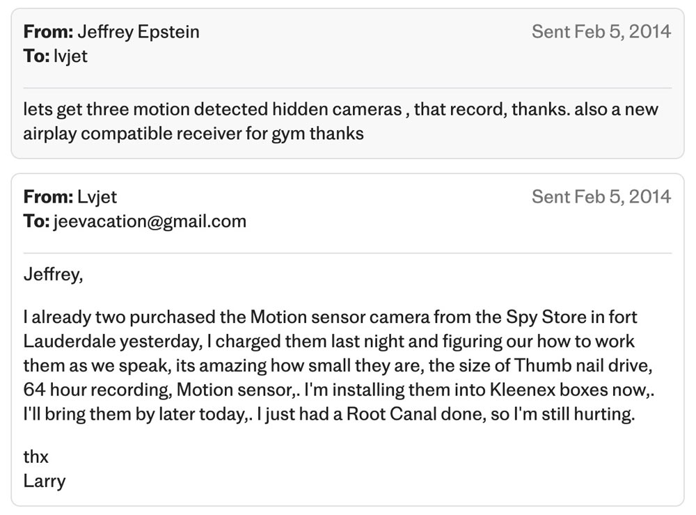 That same year, emails suggest Epstein directed staff to install hidden cameras inside Kleenex boxes.