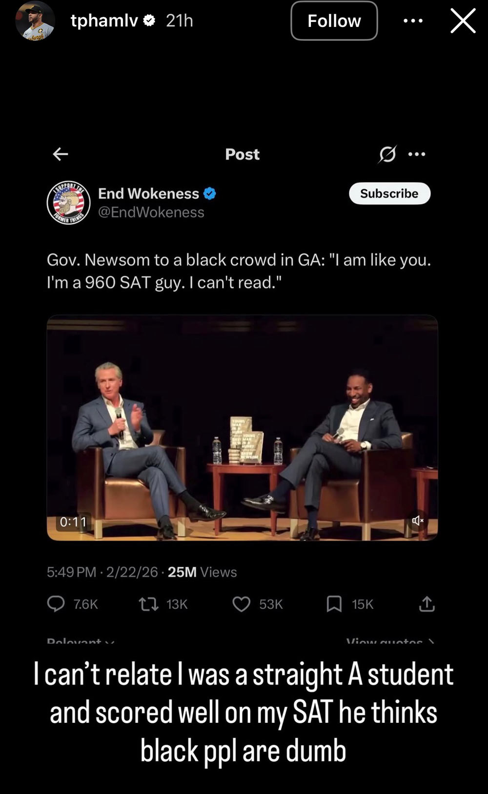 During the interview, Newsom attempted to relate to the black audience by assuring them that “I’m like you” because “I cannot read.”