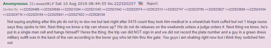 An anonymous 4chan poster said that Epstein was wheeled out of prison hours before his reported death