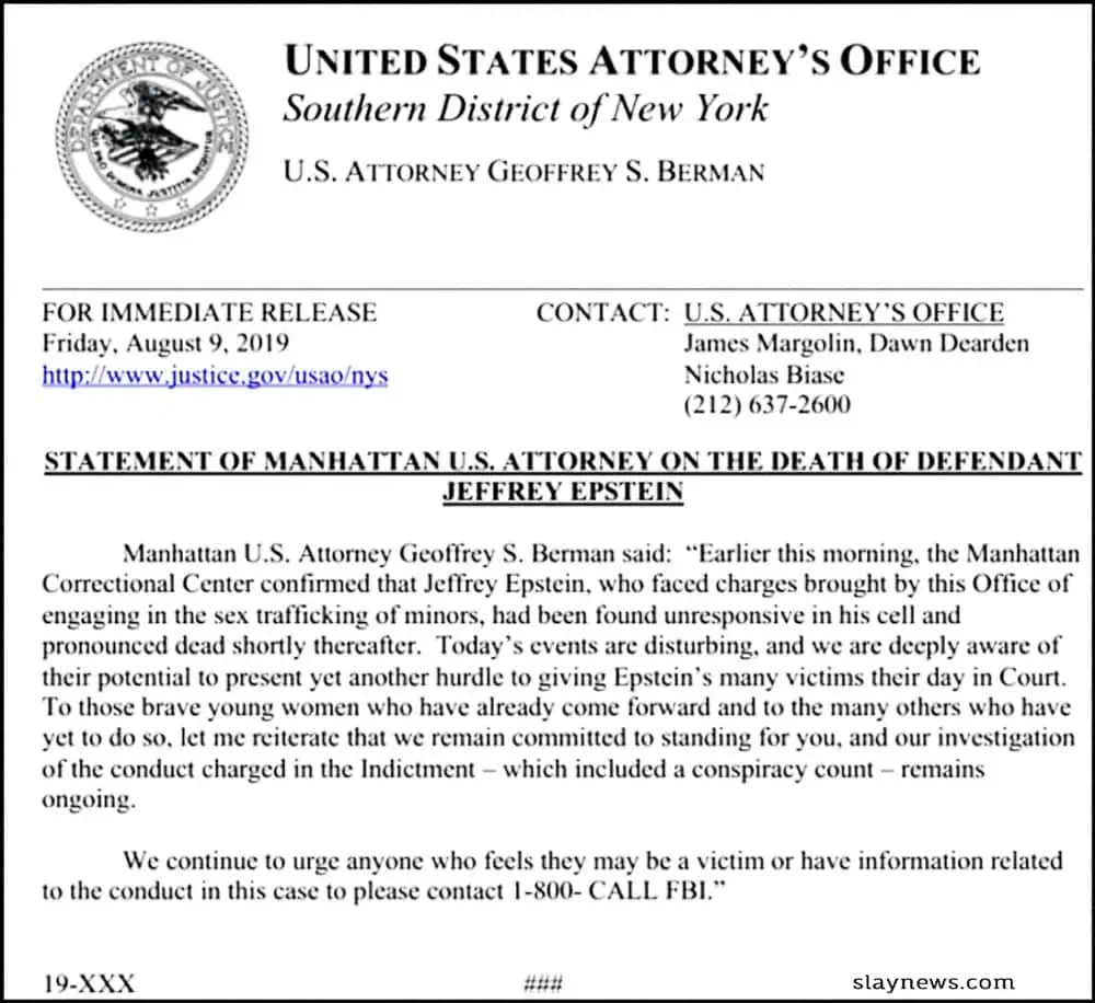 At the center of the revelation is a federal statement from the U.S. Attorney’s Office for the Southern District of New York, dated Friday, August 9, 2019, a full day before Epstein was officially discovered unresponsive.