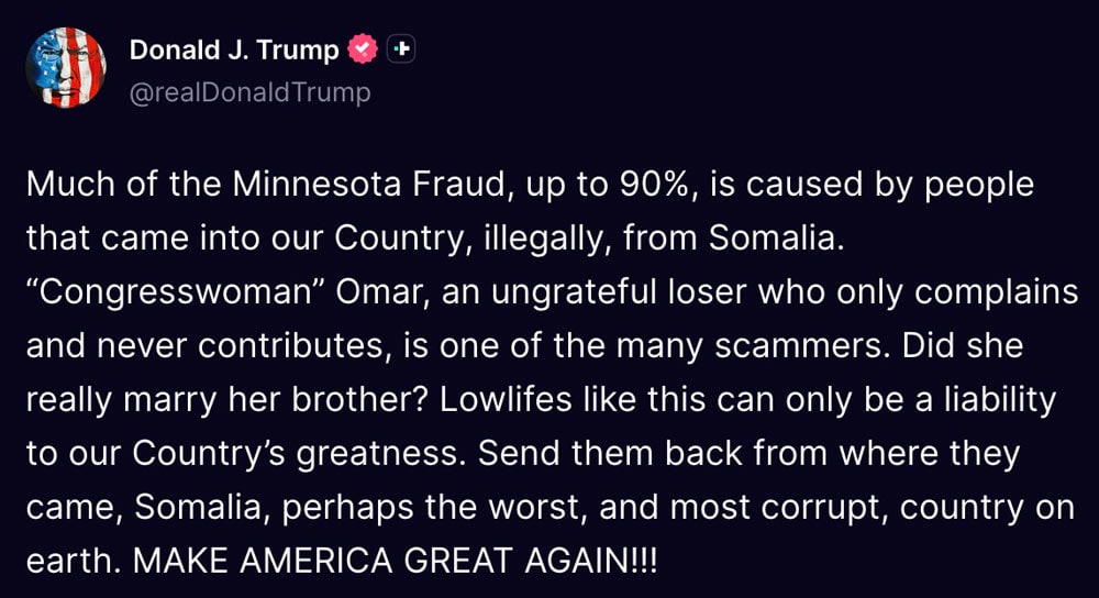 Trump’s criticism of Omar, who isn’t linked to any fraud charges, builds on his earlier December 2025 Cabinet meeting remark that Somali immigrants are “completely taking over” the state.
