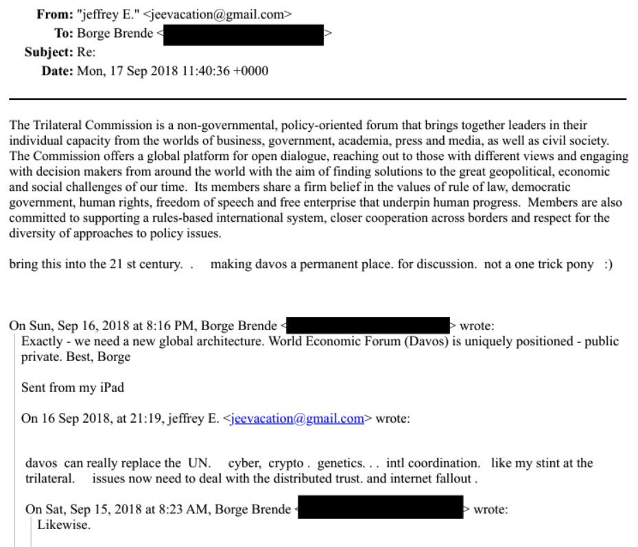 In one exchange, Epstein wrote to Brende describing the Trilateral Commission as: